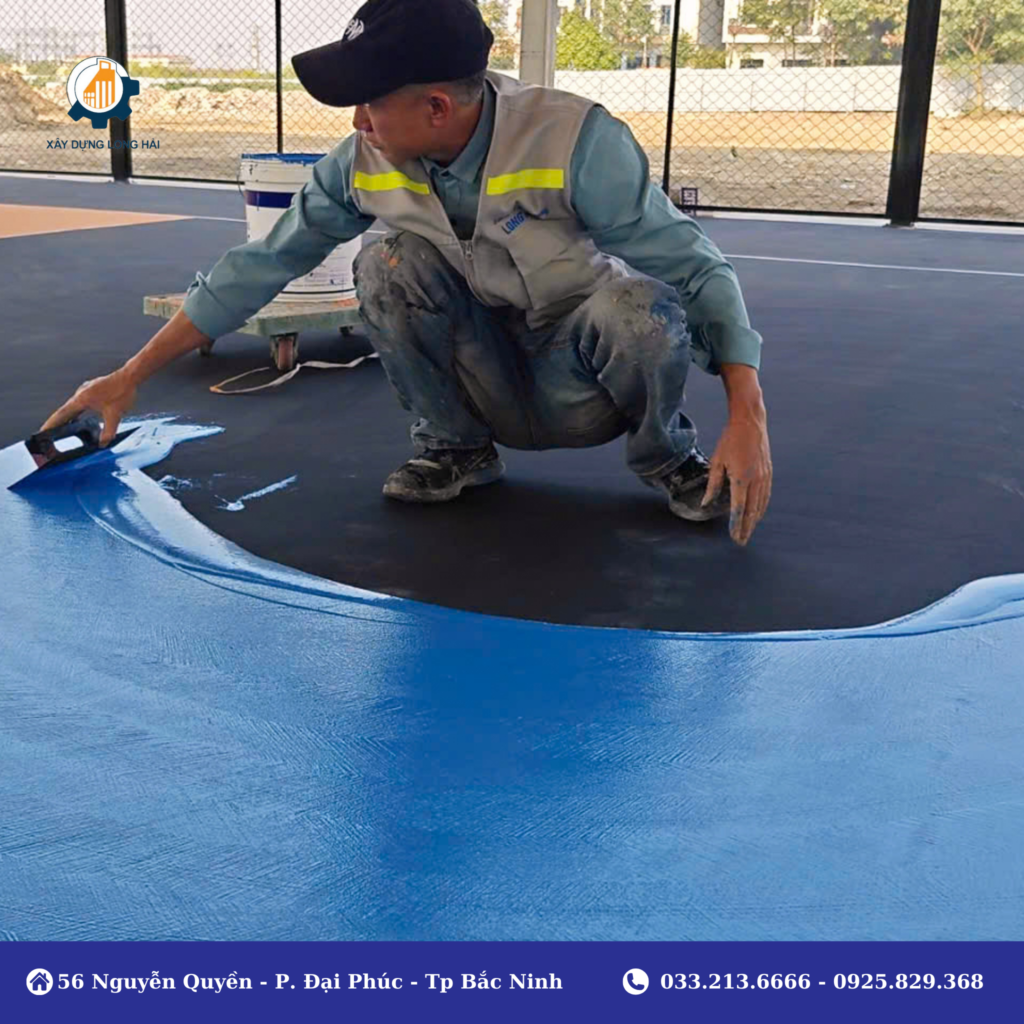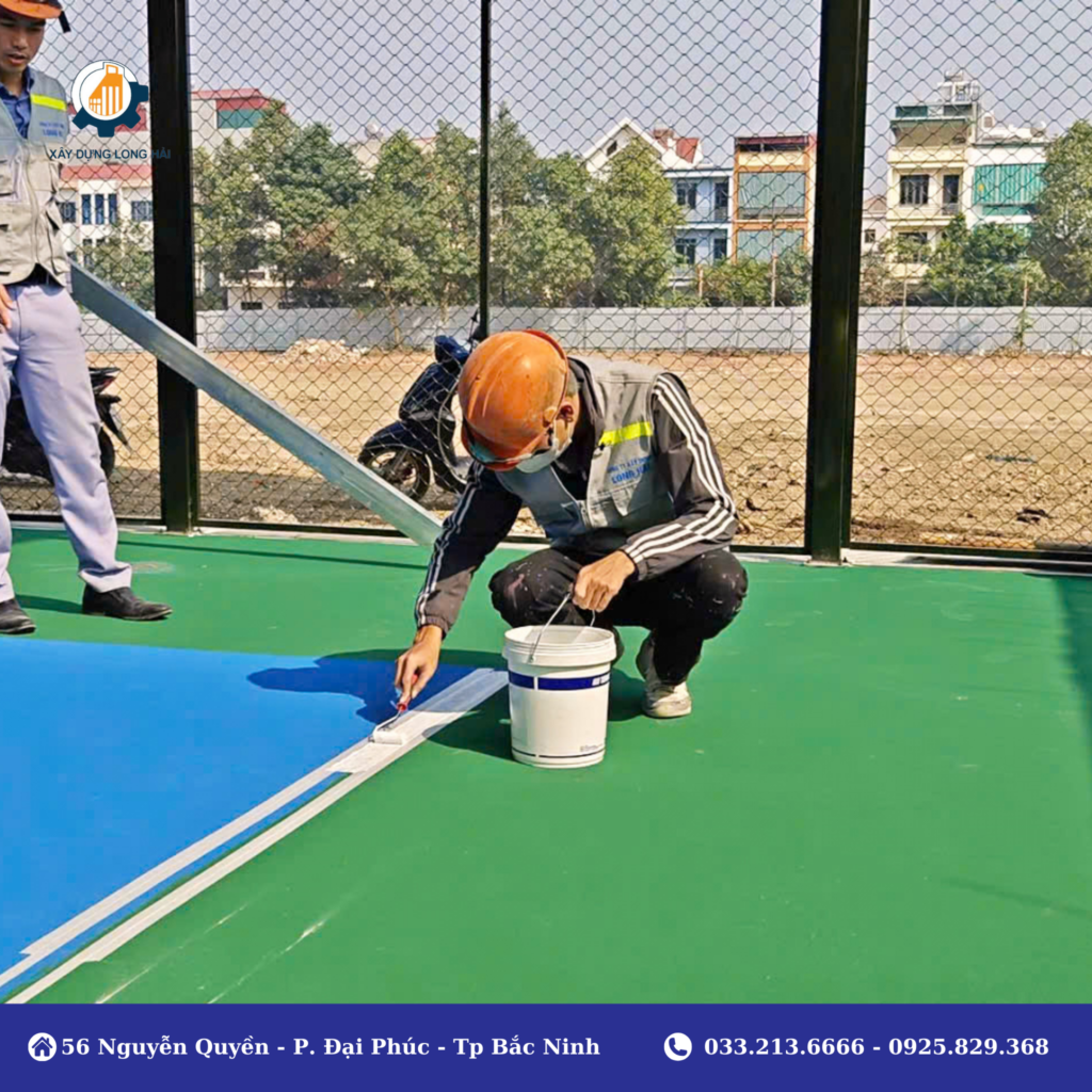 Bước thứ 4:Phủ 2 lớp sơn đệ pha cát thạch anh tạo độ nảy và giảm chấn cho bề mặt sân.